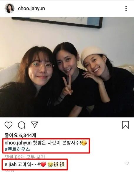 左右滑动可查看更多此前李智雅主演的新剧开播后,她的好友秋瓷炫在INS上传了一张和韩志旼、韩孝周的合照,并配文“首播大家一起死守本放”为好姐妹李智雅的新剧《顶楼》加油支持,随后李智雅在下方留言道“谢谢~~!!”。