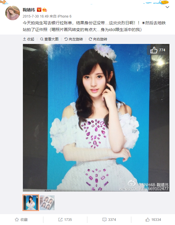 这张照片微博也有发噢,不过言语就没这么做作了,说的是:身为idol跟生活中的我。