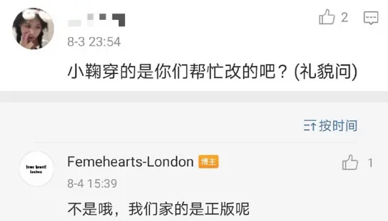 有人去问鞠婧祎穿的衣服是不是这家改造的,品牌回答:不是哦,我们家的是正版呢。