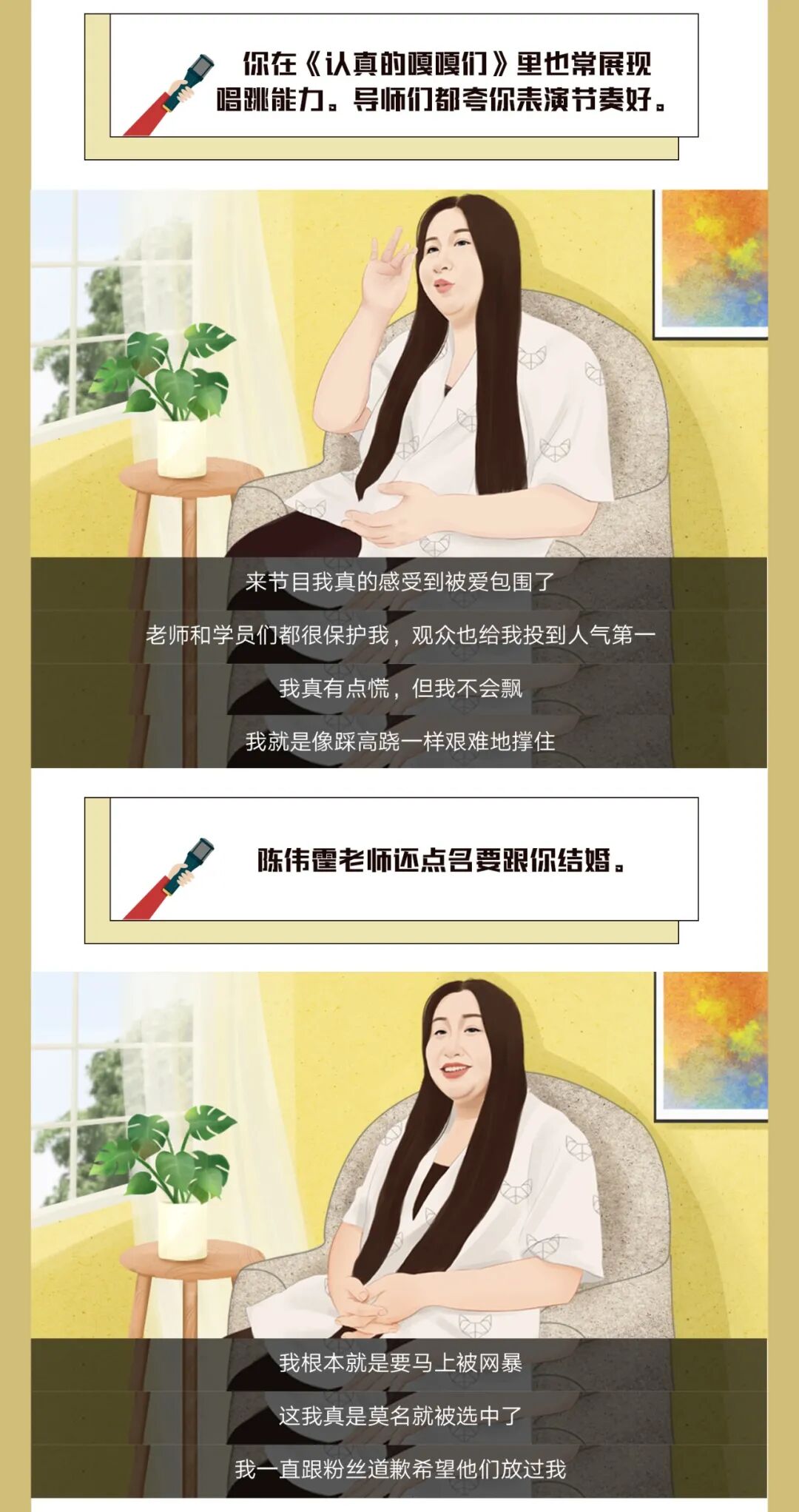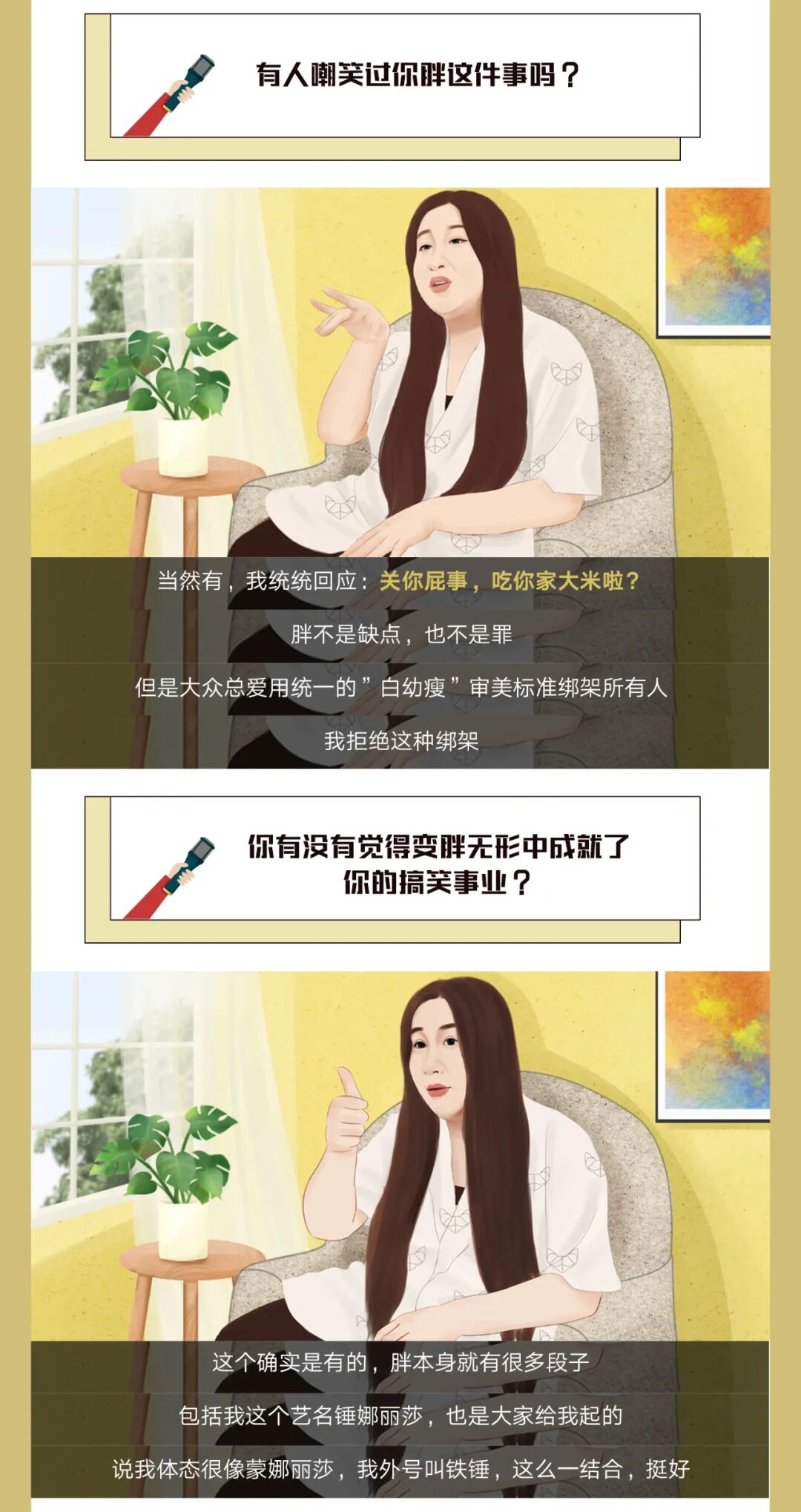 “前女团成员”是她身上反差极大的标签。她自嘲处在体重巅峰,一出现便冲击着观众的固有印象。