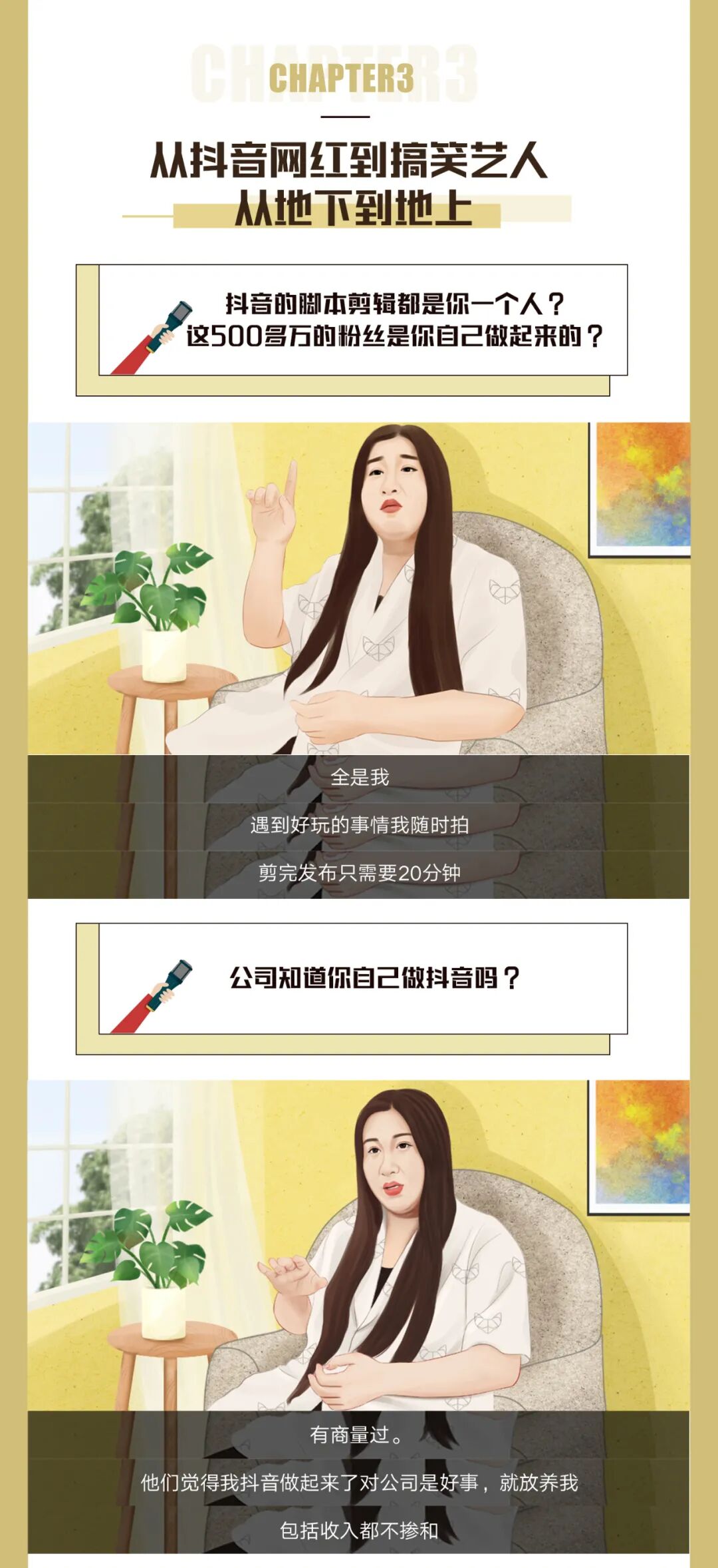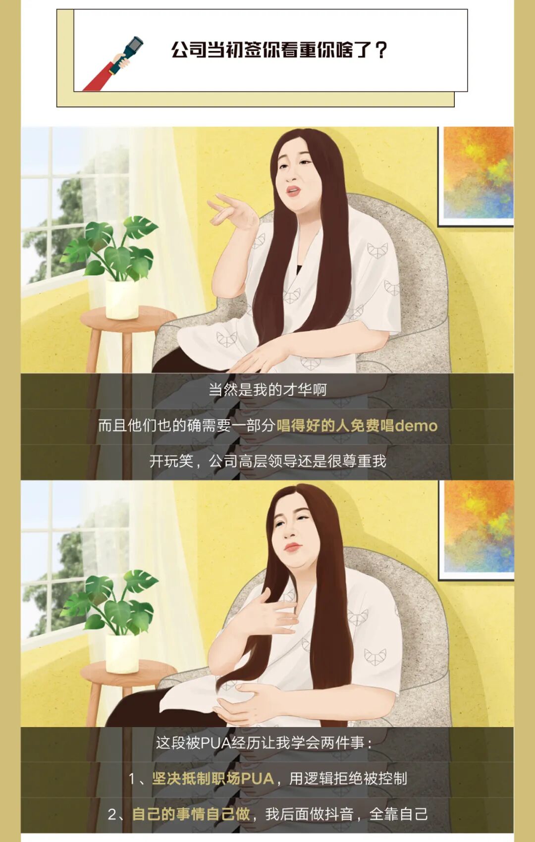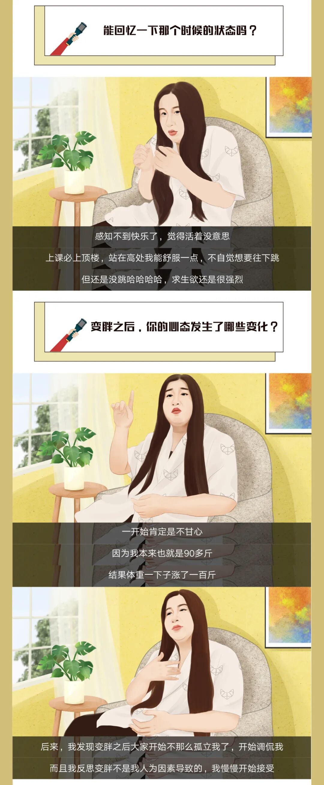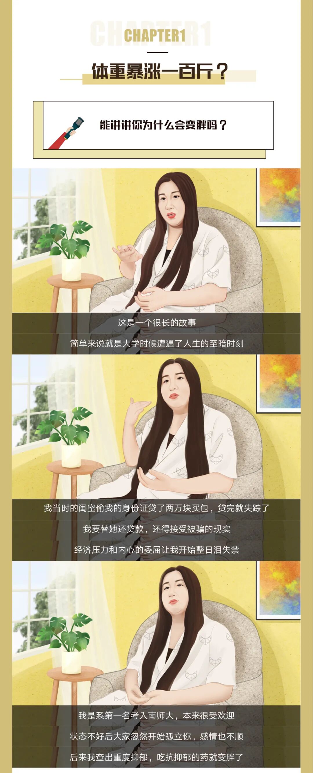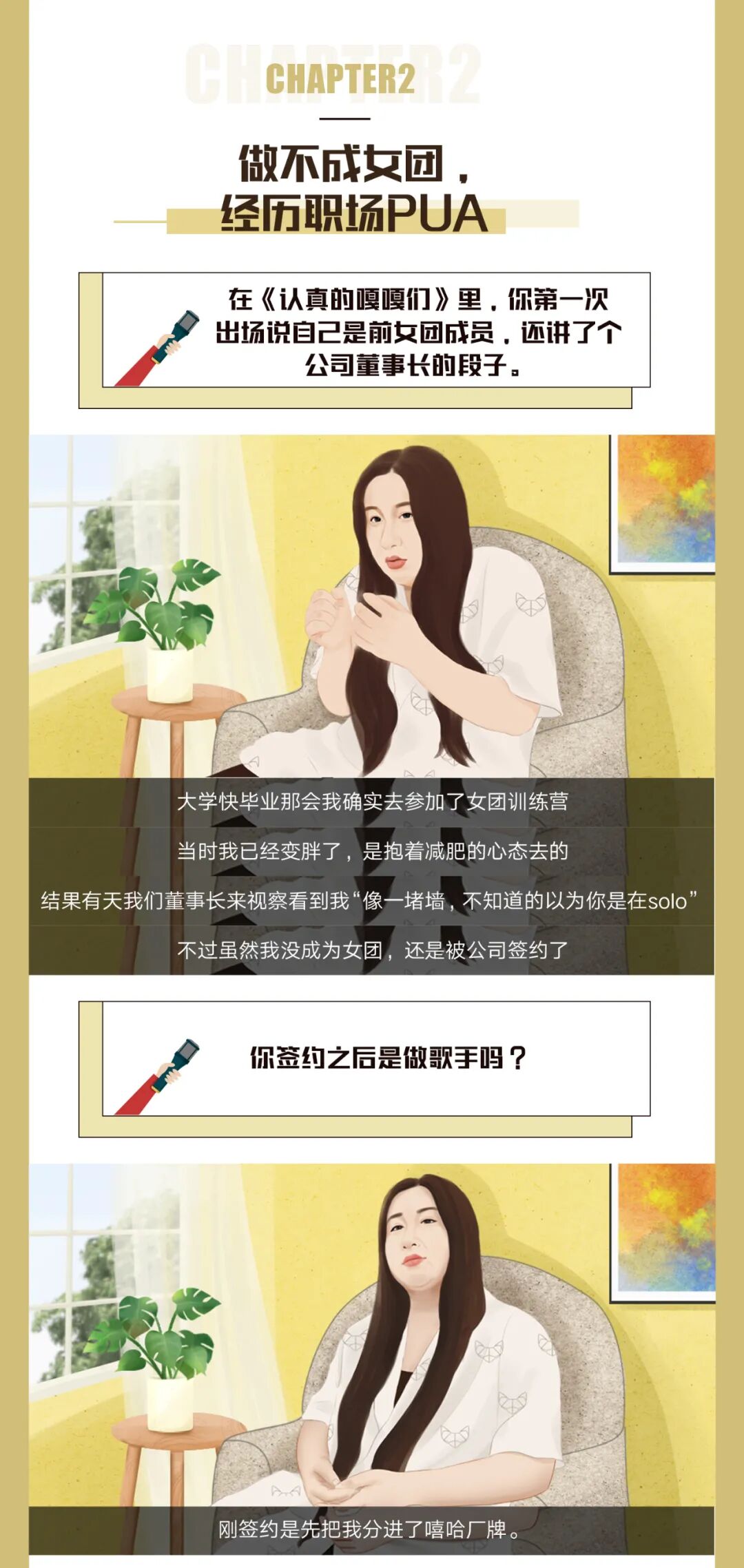 曾经她是个90多斤的标准瘦女孩,治疗抑郁症让她的体重暴涨一百斤。签约公司后,她被分进嘻哈厂牌,经历了职场PUA,学会如何在职场中生存。由于需要独处,她甚至自费补差价升级节目组安排的标间为豪华单人间。
