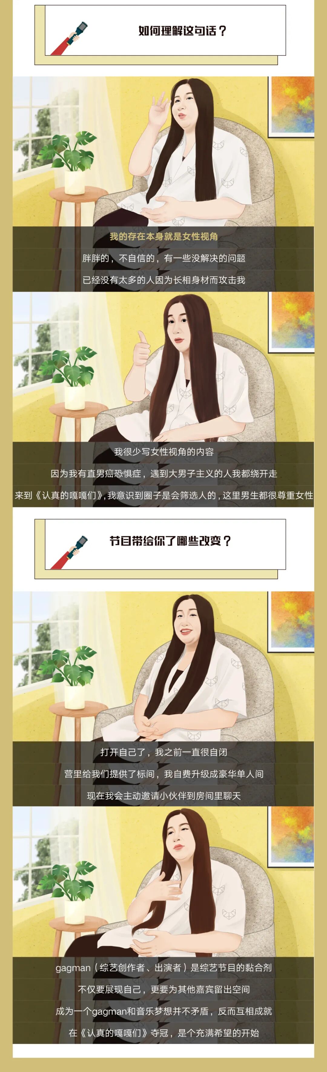 今年6月份,这个胖胖的、笑容大声、浑身是梗的大号女孩,参加腾讯视频《认真的嘎嘎们》的综艺人选秀节目(嘎嘎为gagman的音译,意为综艺创作者,节目旨在选拔综艺喜剧人才),并于今晚的总决赛获得冠军。她在节目里一直是人气第一,何炅李诞大张伟夸她喜剧节奏感特别好,陈伟霆在节目中钦点要跟她结婚。