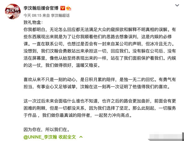 但李汶翰好歹是选秀出来的冠军,有一批死忠。后援会真情实感发文:内娱这一仗我们做得温暖又稳,汶翰值得我们的喜欢。
