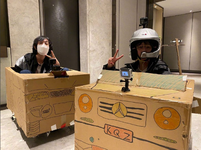 和朋友聚会时,阚清子又切换到了软萌幼稚鬼模式,在家拿纸箱子“改装车”,也是一般人都想不到的吧~