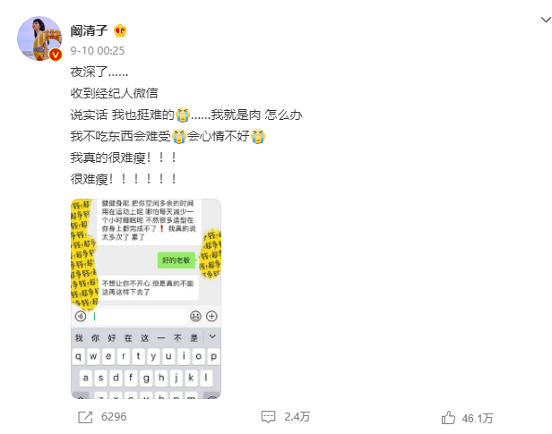 戏里被婆婆逼迫喝药生儿子,戏外阚清子还要被经纪人“逼迫”减肥,看来最近她的日子也是蛮辛苦。