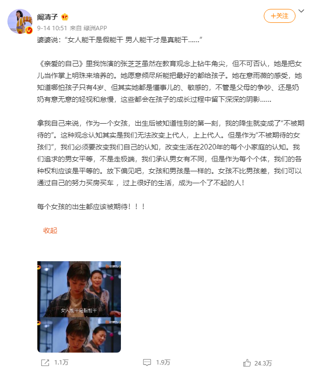 剧中芝芝叫天天不应,叫地地地不灵,饰演者阚清子则在社交网络上发文,声明自己反对重男轻女。更拿自己曾经因为性别而不被期待的经历来举例,希望无论男女,孩子出生时都应该被期待。