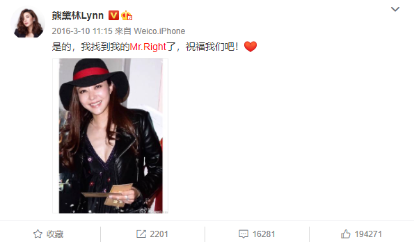 被媒体拍到两人手牵手逛街之后熊黛林也大方的发微博承认恋情,称自己终于找到了Mr.Right。