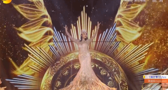 造型方面也大有不同。这届的“金鹰女神”,更像是“金鹰女王”,金光闪闪的亮片鱼尾裙,搭配金色翅膀、超长披风,盘发加红唇更是加特气场,霸气十足,真的有“战袍”的感觉。
