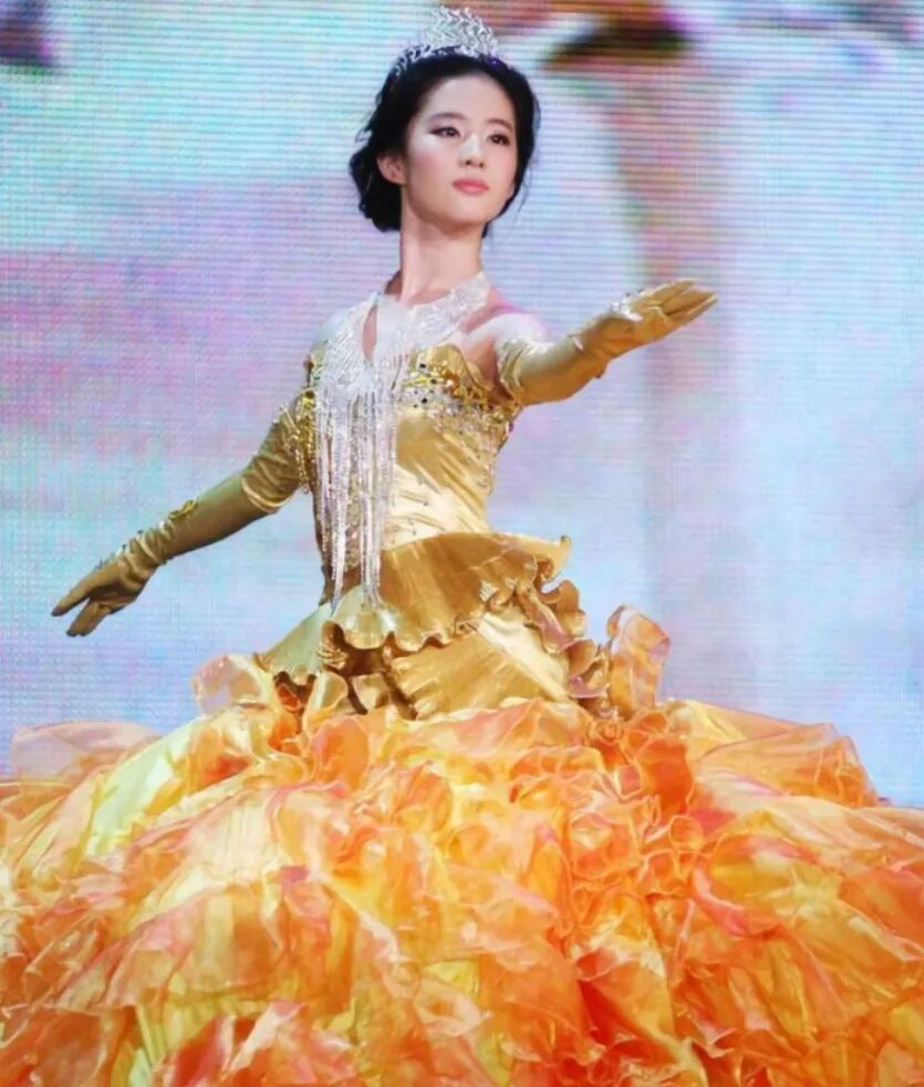 当年金光璀璨的抹胸公主裙,现在看来是有些过分浮夸,不过当时的刘亦菲竟然也完美hold住了,实力演绎“迪士尼在逃公主”本人。