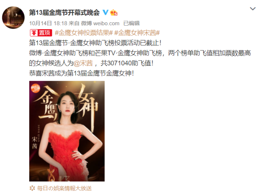 先是“内定”风波,后被清洗票数,宋茜无疑是最尴尬金鹰女神得主了。