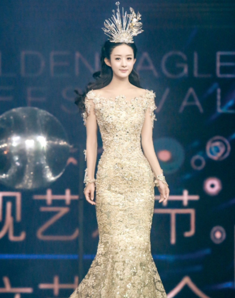 热巴的这件战袍堪称是历届金鹰女神礼服中最为贵气华美的一件。由设计师郭培亲自打造,当年蕾哈娜惊艳Met Gala的黄金战袍就是出自她手。打造过程堪称“大动干戈”,战袍来自Guo Pei 2018春夏高定系列,耗时1200小时,由24k的金线手工刺绣完成,金光璀璨,奢美华丽,而热巴的大气五官和盛世美颜也将这套礼服完美驾驭,出场自带女神光芒。