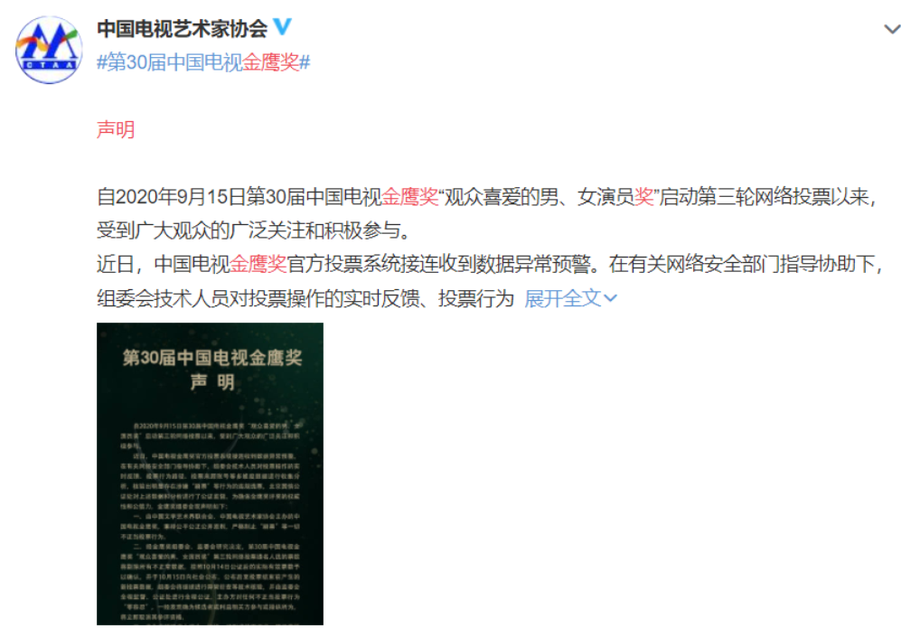 15日当晚公开发布声明,表示“观众最喜爱男女演员”的排名存在刷票的行为,并且将对于所有票数进行核查。