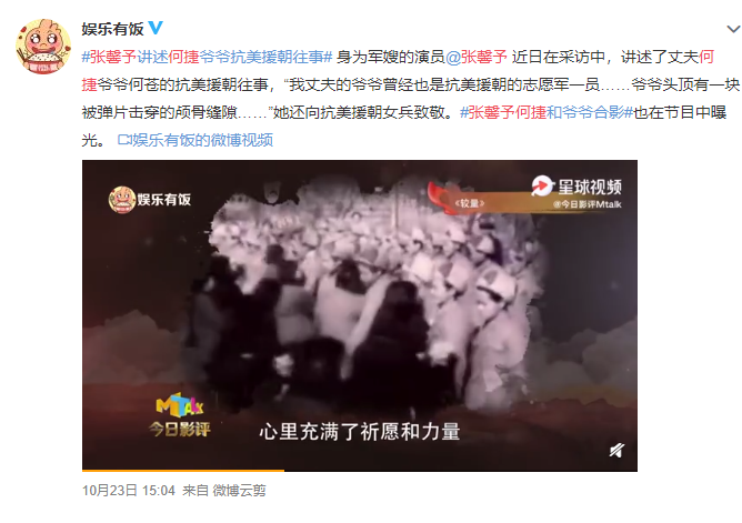 因为多了军嫂的身份,她也常常以正能量演员身份出现,在采访里讲述丈夫爷爷抗美援朝往。