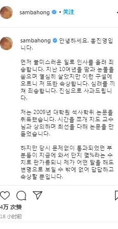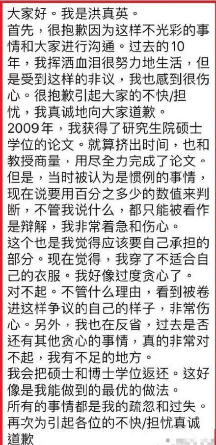 6日晚,洪真英发文回应:“当时被认为是惯例的事情,现在说要用百分百的数值来判断,不管我怎么说,只会被当做是在辩解”,她表示自己会反思、回顾过去,同时返还硕士和博士学位。