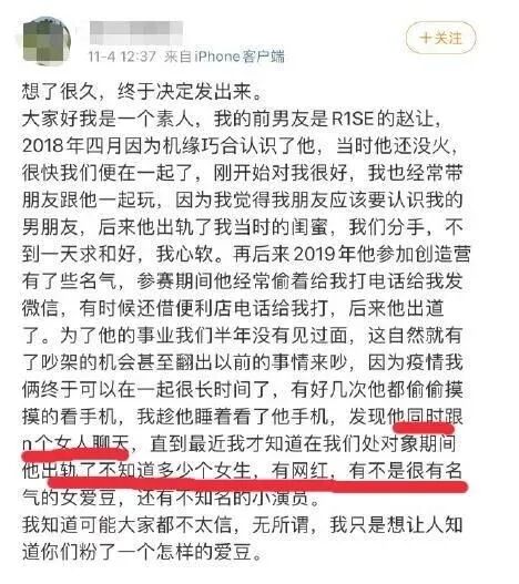 一名自称是赵让前女友的网友发文,自称在2018年4月认识赵让,当时赵让没火,两人也光明正在谈恋爱。在恋爱期间,赵让曾出轨过自己的闺蜜,之后又发现他出轨了很多女网红、演员和爱豆......R1SE再添一【海王】?