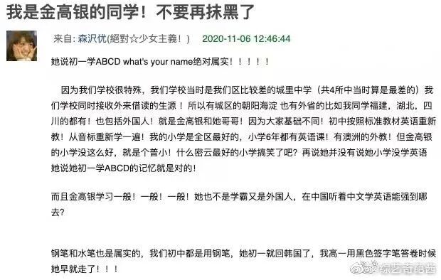 金高银表示记忆中在北京上初一时英语只学到ABCD,回到韩国后英语跟不上进度,后来放弃了;还说到韩国学英语会在学校之外的学院学习,这点令她很吃惊,水性签字笔也是第一次见到。