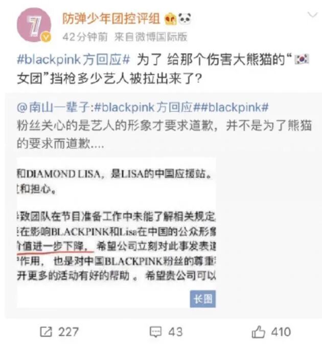 而防弹的控评组还站出来说防弹一事是被拉出来给BLACKPINK挡枪。