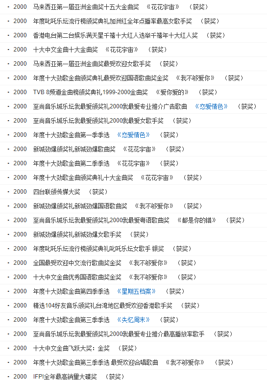 出道25年,发过80多张专辑,拿过上百个流行音乐奖项。专业道路上成绩斐然,还先后在2004年与2009年拿到了世界十大杰出青年和世界青年领袖的称号。这样的成绩,在香港娱乐的女艺人中,除了她,别无他人。