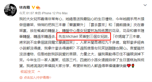 在最新发布的微博中除了提到了自己的新书即将出版、林青霞还透露了与老公及女儿们相处的日常,还晒出了继女刑嘉倩亲手为她制作的生日礼物。