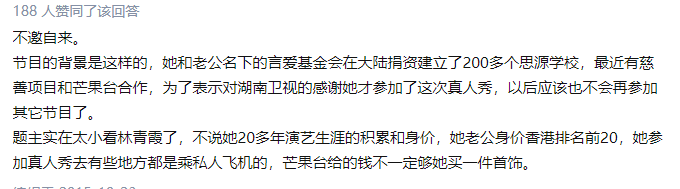 但很快就有网友曝料,原来是林青霞老公旗下的公益基金赞助了节目林青霞为了表示感谢,所以来参加,但是传言的真实性也有待考证,可以确定的是对于“缺钱”的说法还真的是多虑了。