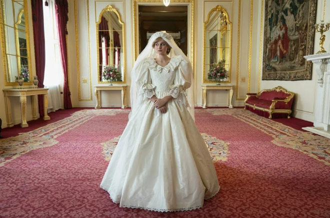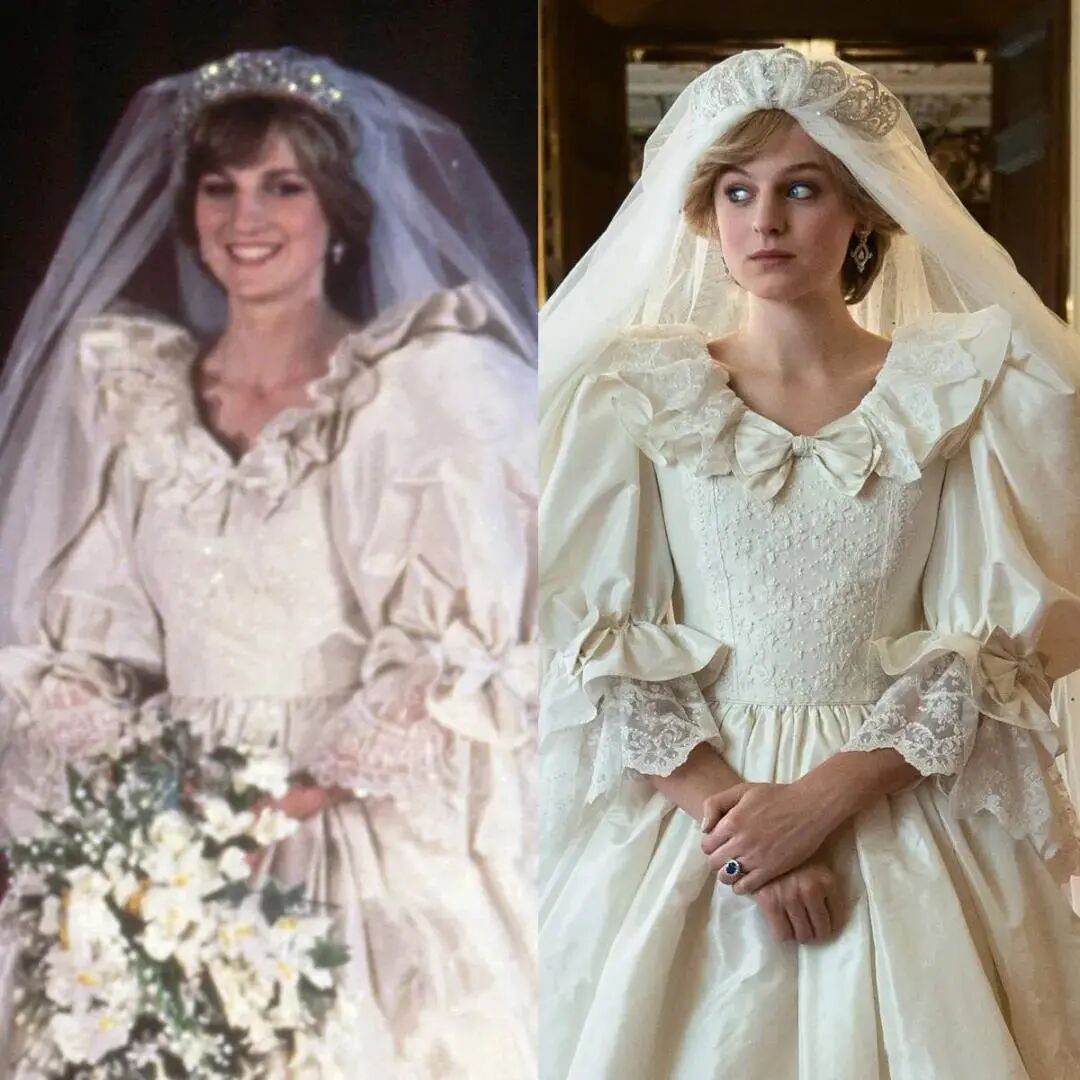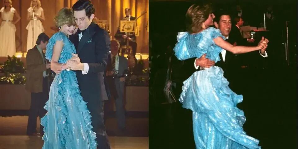 在这场注定的悲剧中,戴安娜王妃与查尔斯王子的英国皇室式梦幻婚礼,成为她人生中唯一的高光时刻,黛安娜王妃身上的绝美婚纱,在剧中也被一比一还原出来。