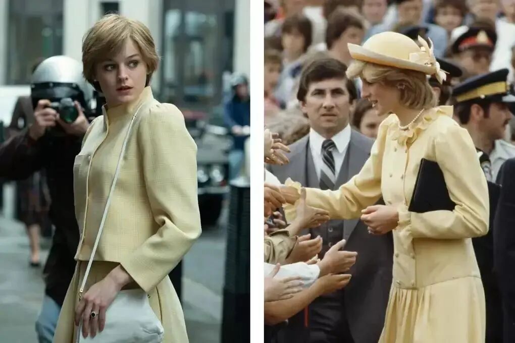 鲜嫩鹅黄套装搭配白色单肩包简洁清爽,这是戴安娜出席活动时留下的影像,在艾玛的重新演绎下愈发灵动。