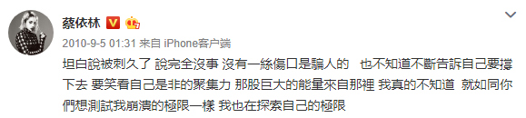 “被刺久了,没有一丝伤口是骗人的”。因网络暴力而崩溃的明星有太多,这是那些网络暴民最想看到。而在最痛苦的时候,蔡依林也只是发了一条微博回应:“如同你们在测试我崩溃的极限一样,我也探索自己的极限。”