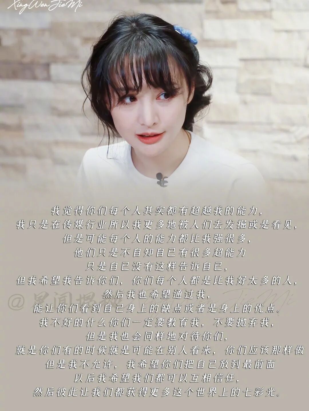 相比于此前的少言寡语,郑爽也慢慢的悟出了新的“爽言爽语”,她不止一次感谢粉丝们的支持,也深知做艺人不能永远当红,她想保持本真,也学会渐渐改变。
