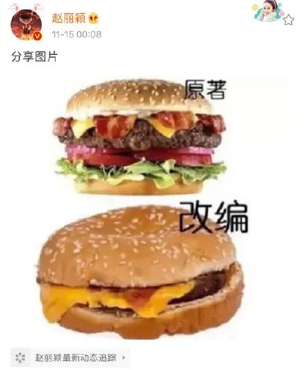 后续的热搜里,最出名的就是赵丽颖发汉堡图内涵编剧乱改剧本。