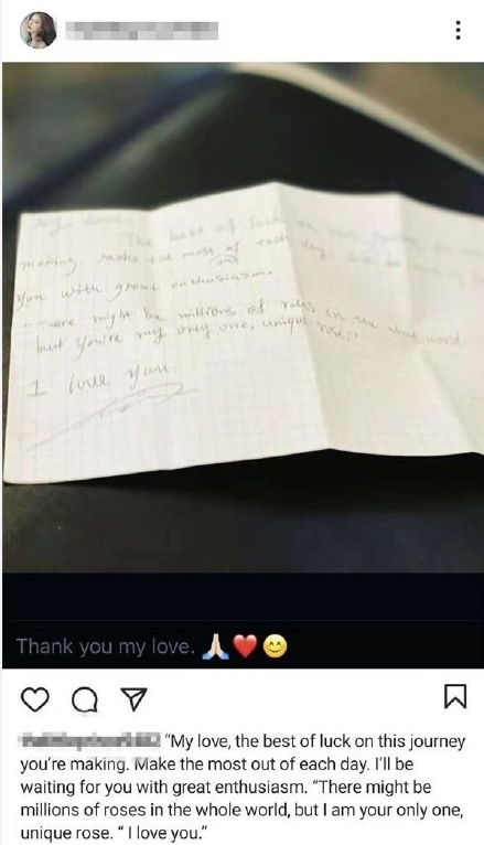 女生还附上了高圣远的手写情书,高圣远写道:"世界上有数百万朵玫瑰,但我是你独一无二的玫瑰。"女生的社交账号至今只发过两条动态。这两条动态不但内容都与高圣远有关,而且还都关联了高圣远的社交账号名称。