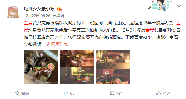 最近的一次热搜,是金晨被曝与贾乃亮深夜约会,两人在同一酒店的地库被拍到。