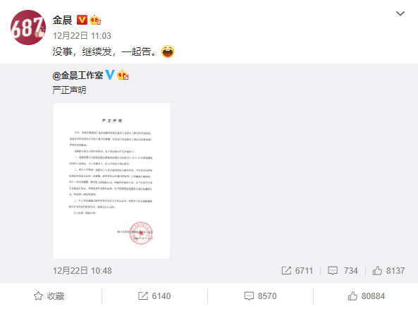 金晨工作室火速辟谣:假的。性格耿直的金晨姐姐也转发回应:继续发,一起告。