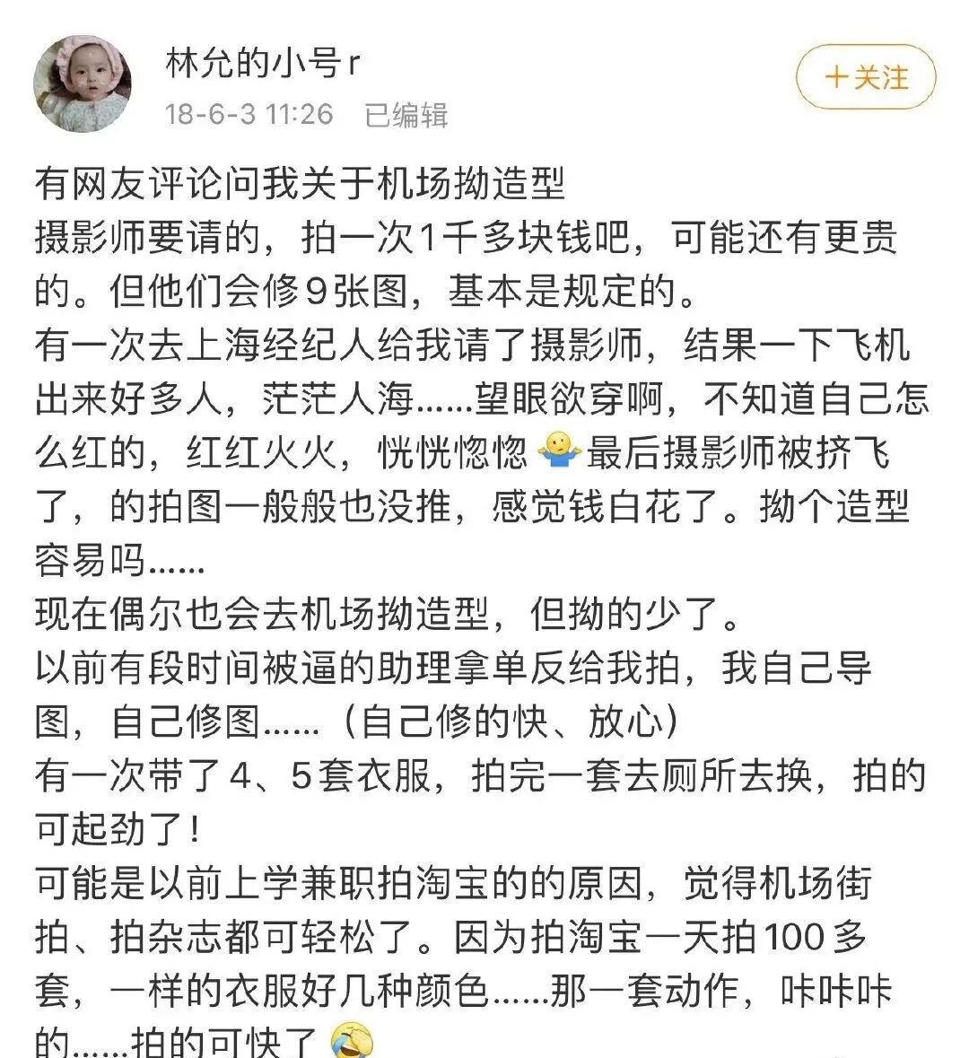 耿直林允还专门发小号写过,明星们要专门请摄影师拍机场照,摄影师一次的费用是一千多块明星有时候会带四五套衣服,一套拍完了就去厕所换第二套。
