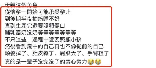 之前,Ella曾在节目中说过女人生产有多么不容易,自己因为生劲宝,有长达2年的时间处于尿失禁的状态。