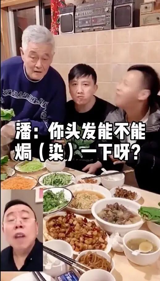 视频中,赵本山一边和两个徒弟吃饭,一边和潘长江视频连线。潘长江问赵本山最近咋样,并称头发能不能染一下,赵本山回他:“我还这样啊”、“你能不能踩高跷来吧”、“长啥样算啥样呗”