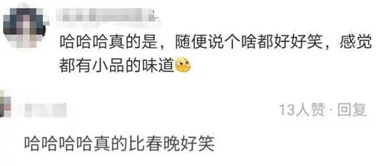 网友们被二人逗得不行,有人说这对话好像春晚小品,有人觉得这俩人说啥都好笑,说啥都是小品的味道