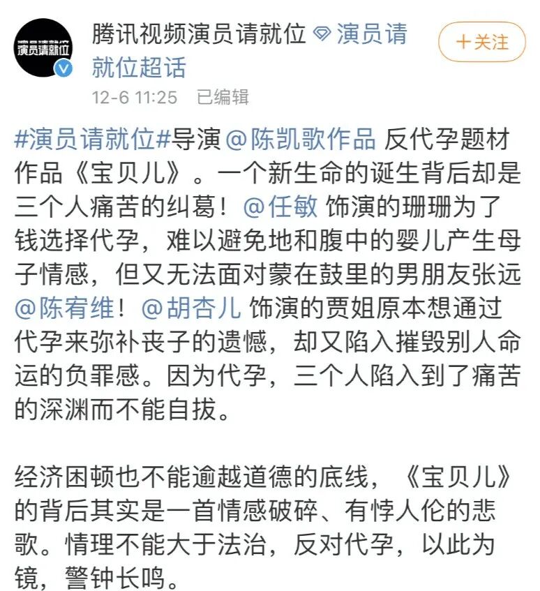 《演员请就位》的官方微博对《宝贝儿》进行了介绍,称是陈凯歌导演的反代孕题材作品,“一个新生命的诞生背后却是三个人痛苦的纠葛!”“因为代孕,三个人陷入到痛苦的深渊而不能自拔。”