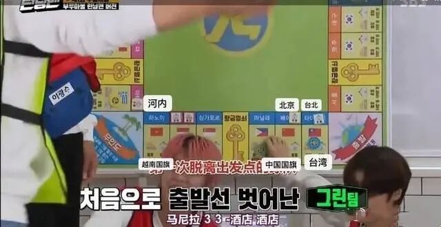 在6日播出的《Running Man》中,演出人员分组玩“Blue Marble”游戏(一款在世界主要城市盖房子投资的棋类桌游),游戏道具板上出现了五星红旗和台湾旗帜并列的画面。