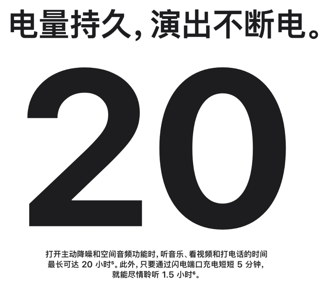 续航方面,AirPods Max 启用主动降噪和空间音频功能时,听音乐、看视频和打电话的时间最长可达20小时。此外,通过闪电端口充电5分钟,就能聆听1.5小时。