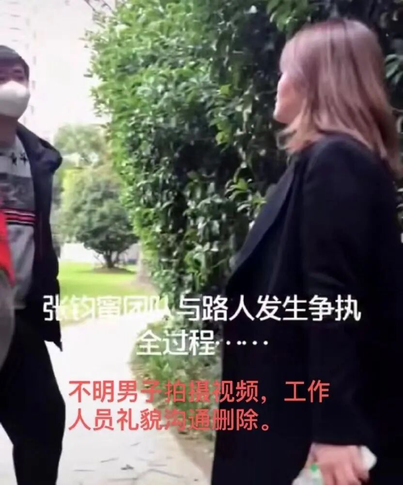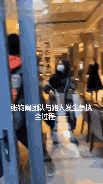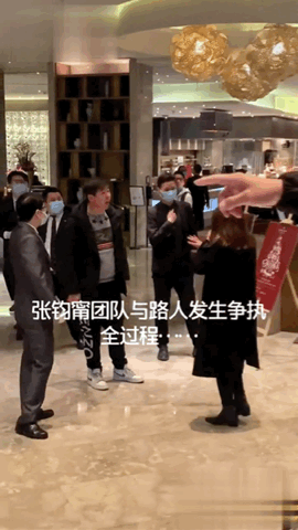 而在张钧甯和团队后面,一个拿着相机、穿运动裤的男子大声怒骂。几位酒店保安上前阻挡,男子依然不依不饶。