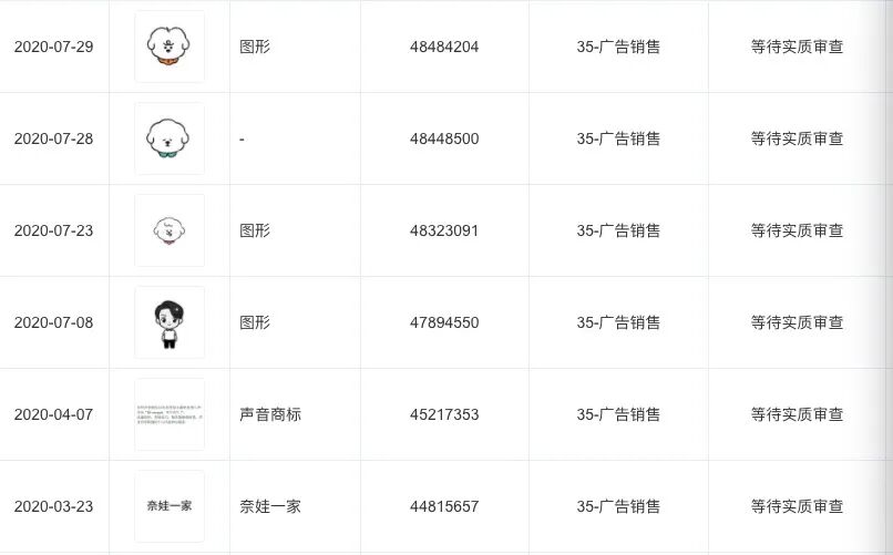 值得注意的是,除了声音商标“Oh my god,买它买它!”,该公司还注册了不少“奈娃家族”的图形商标,多数的申请状态为“等待实质审查”。