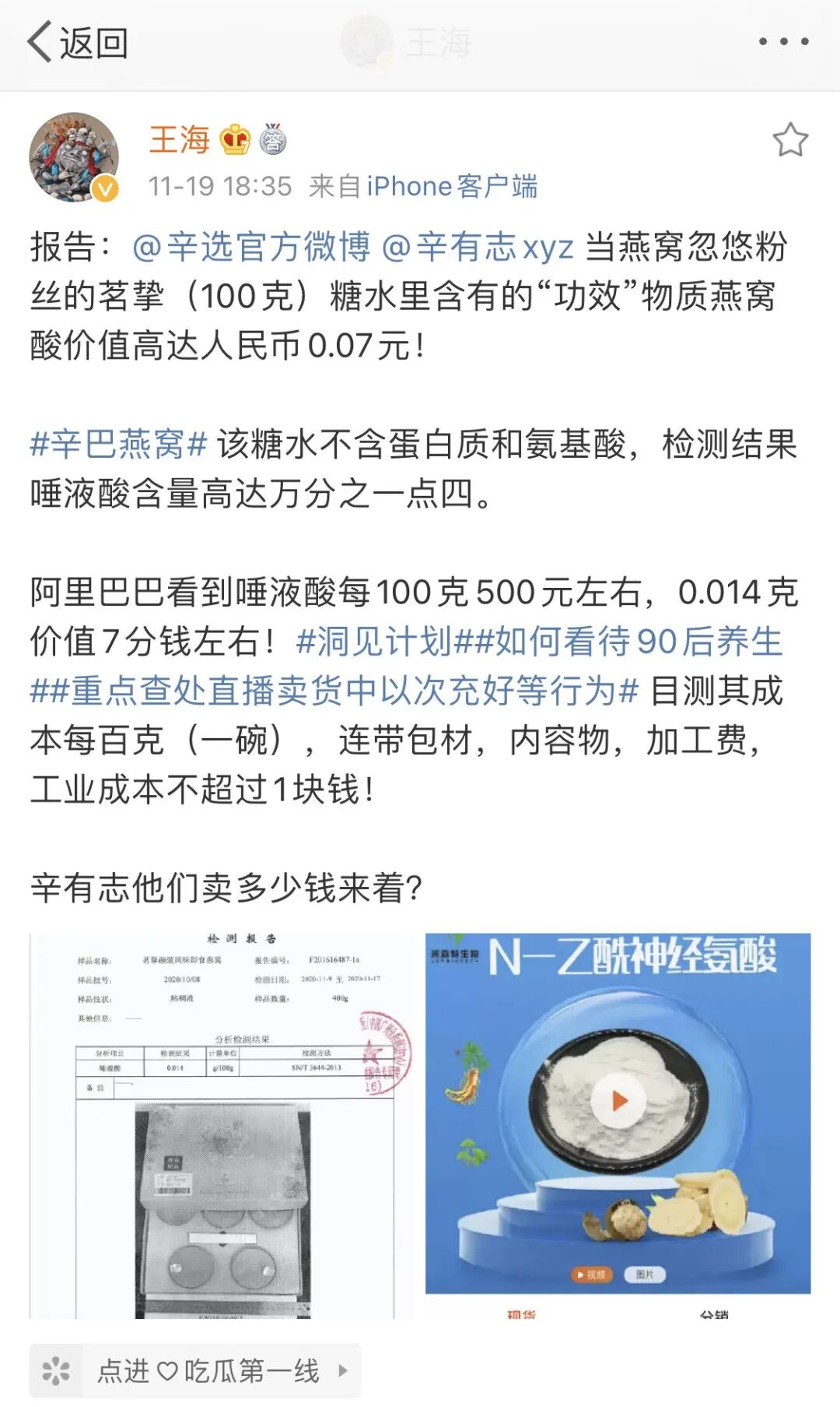 最近,打假人王海指控辛巴所售的即食燕窝产品“就是糖水”;辛巴方否认了指控,并称公司是按照融昱公司提供的产品信息进行直播推广,已将产品送检,若消费者对产品不满,可申请退款退货,自己会全力帮消费者维权。
