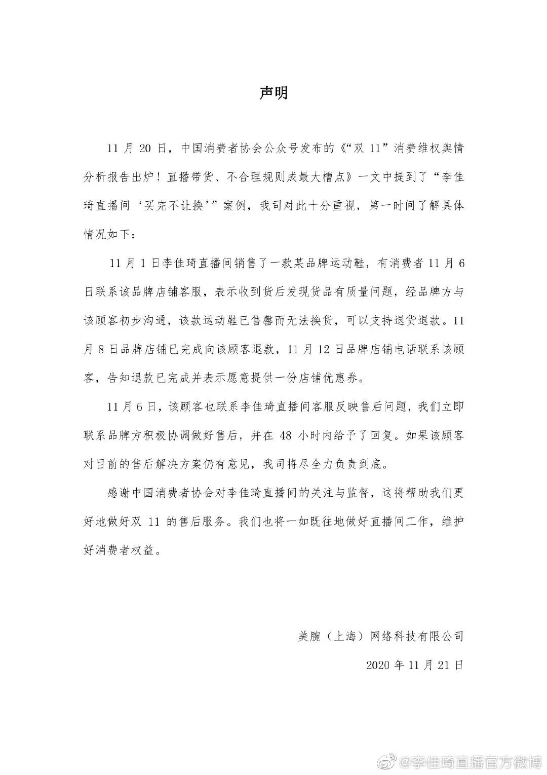 11月21日,李佳琦直播官方微博紧急回应称,消费者曾在11月6日将问题反映给品牌方和李佳琦直播间,厂商因为当时货品已售完无法换货,11月8日,已经进行了退款。如果对目前的售后解决方案仍有意见,会负责到底。