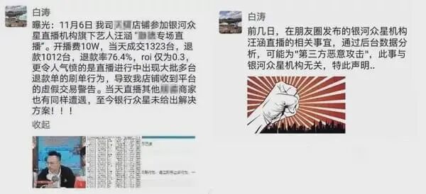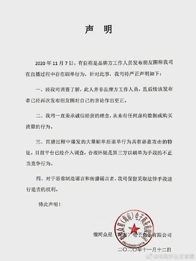 11月12日晚,上海银河众星电子商务有限公司也发布声明称:2020年11月7日,有自称是品牌方工作人员发布朋友圈称我司在直播过程中存在刷单行为,经我司调查了解,此人并非品牌方工作人员,且后续该发布者已经再次发布朋友圈对自己的言论作出更正。