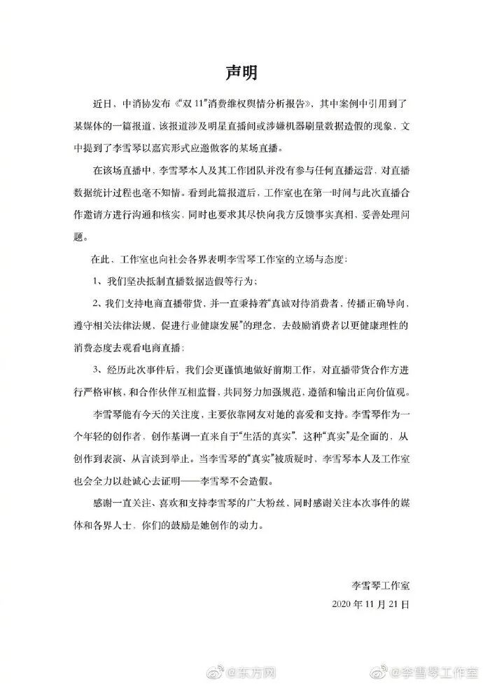 11月21日,在被中消协点名后,李雪琴工作室回应直播数据“注水”一事。李雪琴表示,那场直播自己仅作为嘉宾参与,工作职责就是和嘉宾、观众互动,自己和团队对直播上的数据问题并不知情。