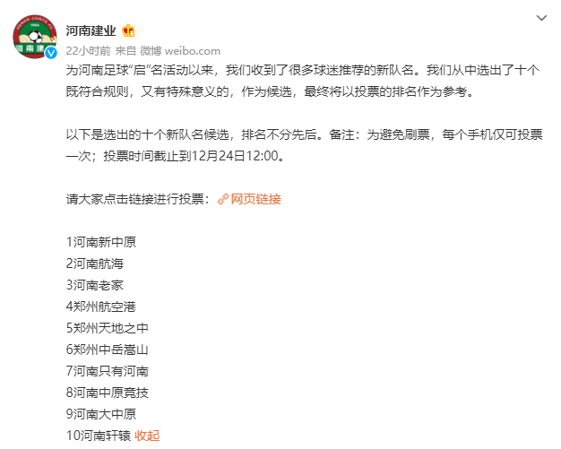 12月22日晚,河南建业官方从球迷推荐的新队名中挑选出十个既符合规则,又有特殊意义的候选名,并发布公开投票。