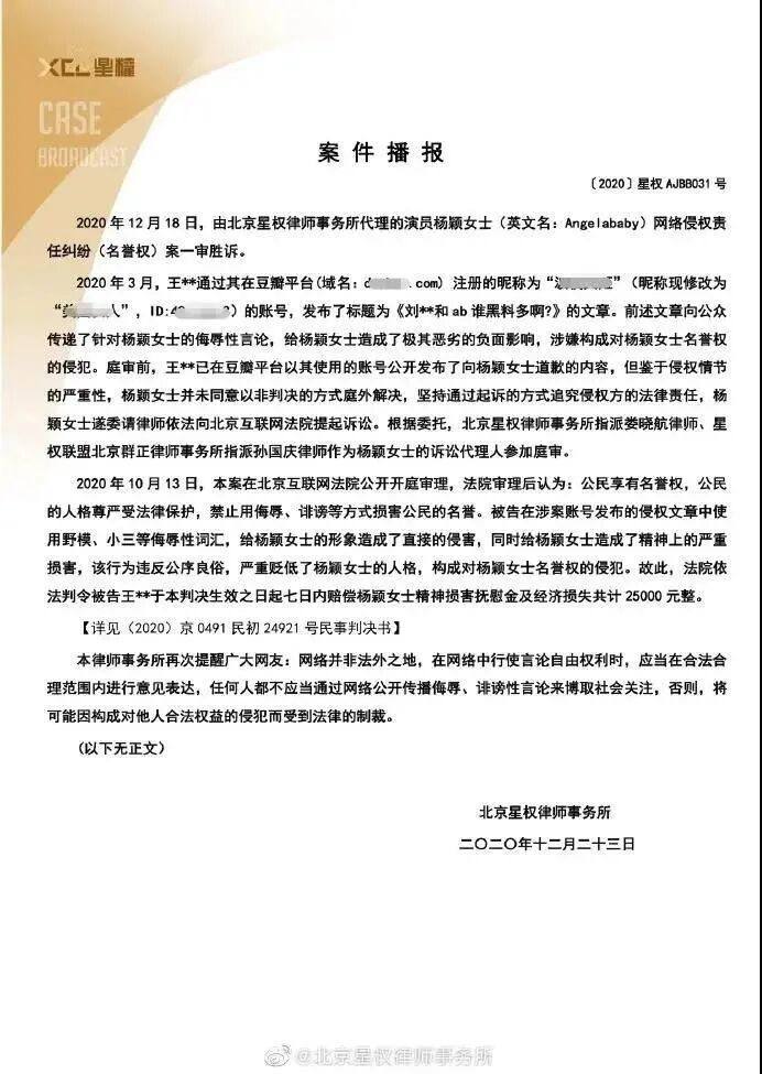 12月23日,北京星权律师事务所发布案件播报,艺人杨颖(英文名:Angelababy)网络侵权责任纠纷(名誉权)案一审胜诉。