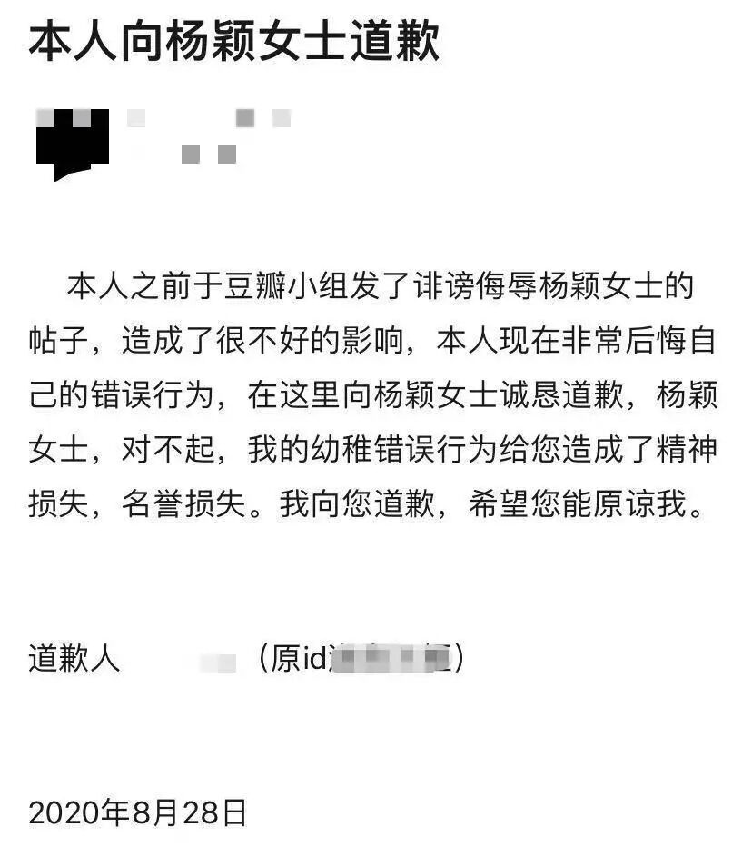 播报中称,豆瓣用户王某某在其注册、使用的社交账号中公开发布针对杨颖的侮辱性言论,被判构成对杨颖名誉权的侵犯。