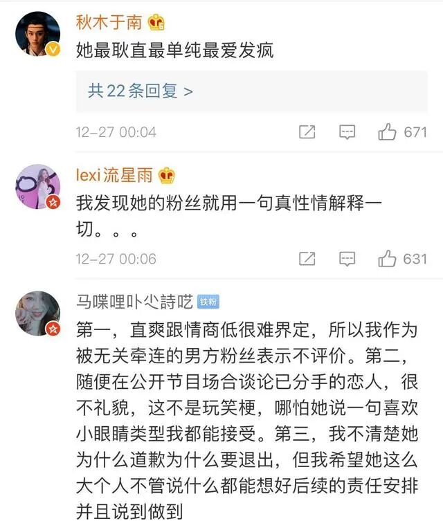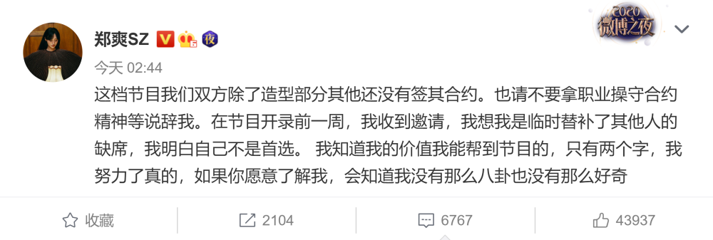 “这档节目我们双方除了造型部分其他还没有签其合约。也请不要拿职业操守合约精神等说辞我。在节目开录前一周,我收到邀请,我想我是临时替补了其他人的缺席,我明白自己不是首选。我知道我的价值我能帮到节目的,只有两个字,我努力了真的,如果你愿意了解我,会知道我没有那么八卦也没有那么好奇”