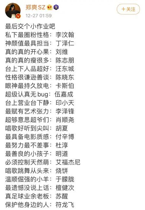 道歉后,郑爽今天凌晨又发小作文,称赞《追光吧哥哥》节目中的哥哥们。
